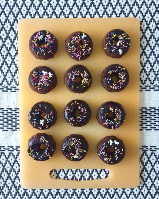 Grease the donut baking tin with a little butter and then add the donut mixture to the tin. Bake in the oven for 8 minutes.
