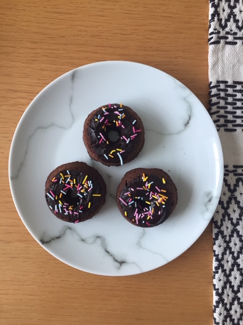 Once cooled, dip each donut into the glaze bowl to cover the top, sprinkle with a topping of your choice (I opted for unicorn sprinkles!)