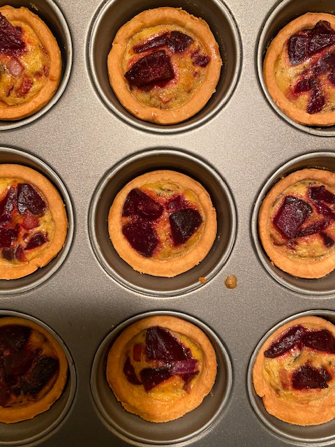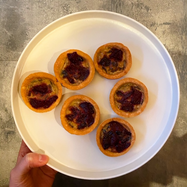 For the pastry, add the flour, xanthan gum and butter together, rub in the butter to make breadcrumbs. Add in the beetroot juice and water and mix to form a dough. Wrap in clingfilm and pop in the fridge for 30 minutes.