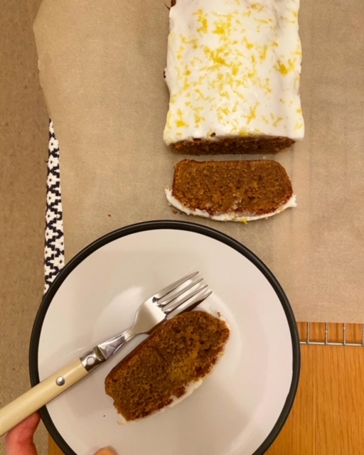 Once the cake is completed cooled, remove from the tin. Combine the icing ingredients together, adding two teaspoons of water at a time until the icing has the right consistency. Then drizzle on the whole cake, going from one side to the other. I then topped mine with extra lemon zest on top.